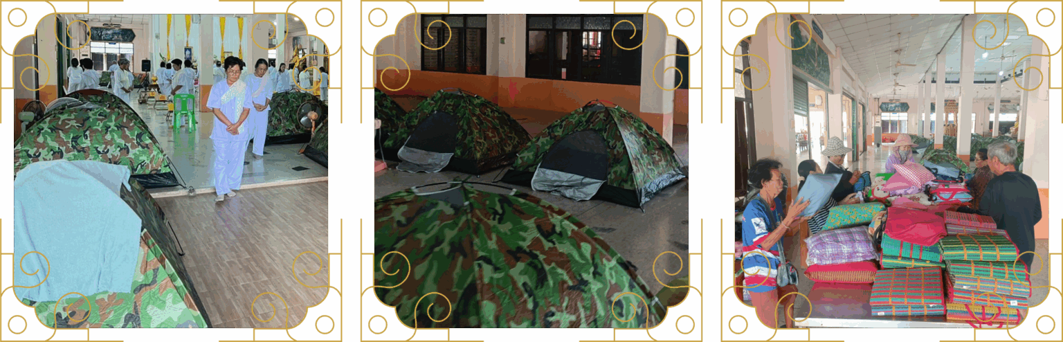 ศาลาการเปรียญ ทางวัดจะมีเต้นท์ พัดลม หมอน เสื่อ ผ้าห่ม สำหรับนอนพักให้คนละหลัง